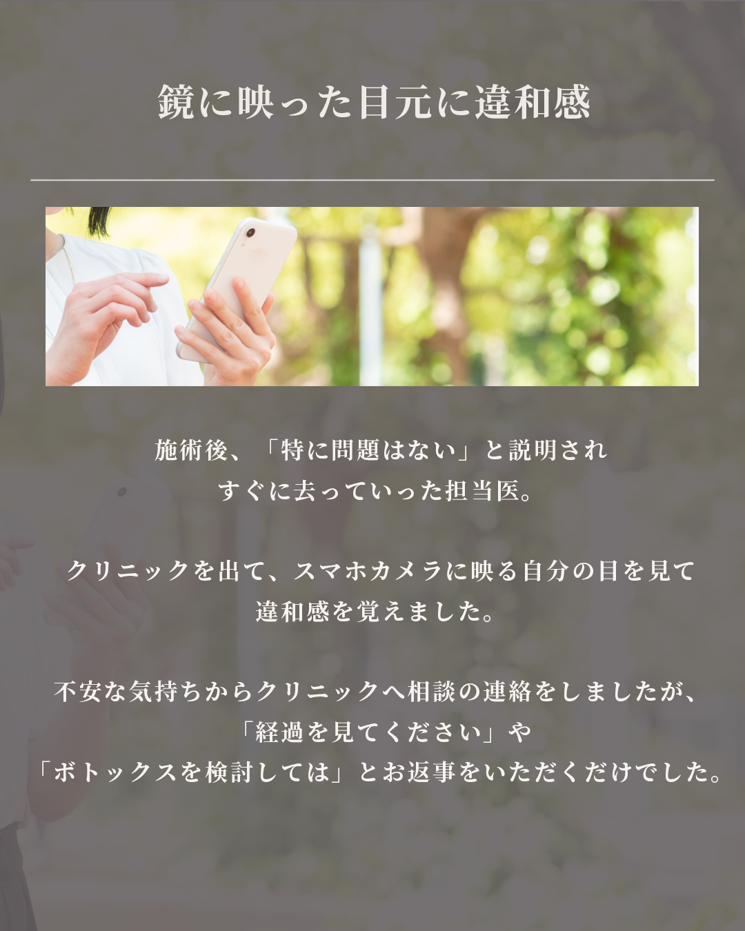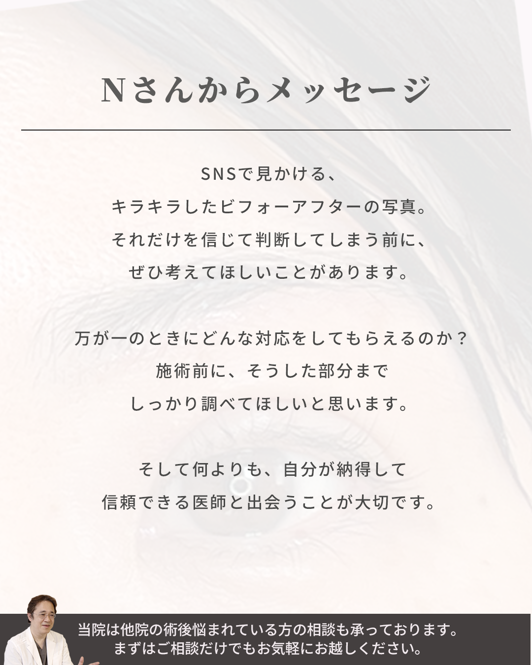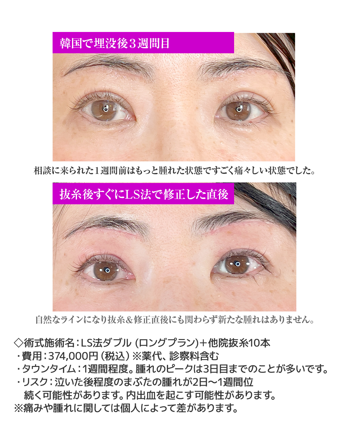 ・リスク:泣いた後程度のまぶたの腫れが2日~1週間位続く可能性があります。内出血を起こす可能性があります。