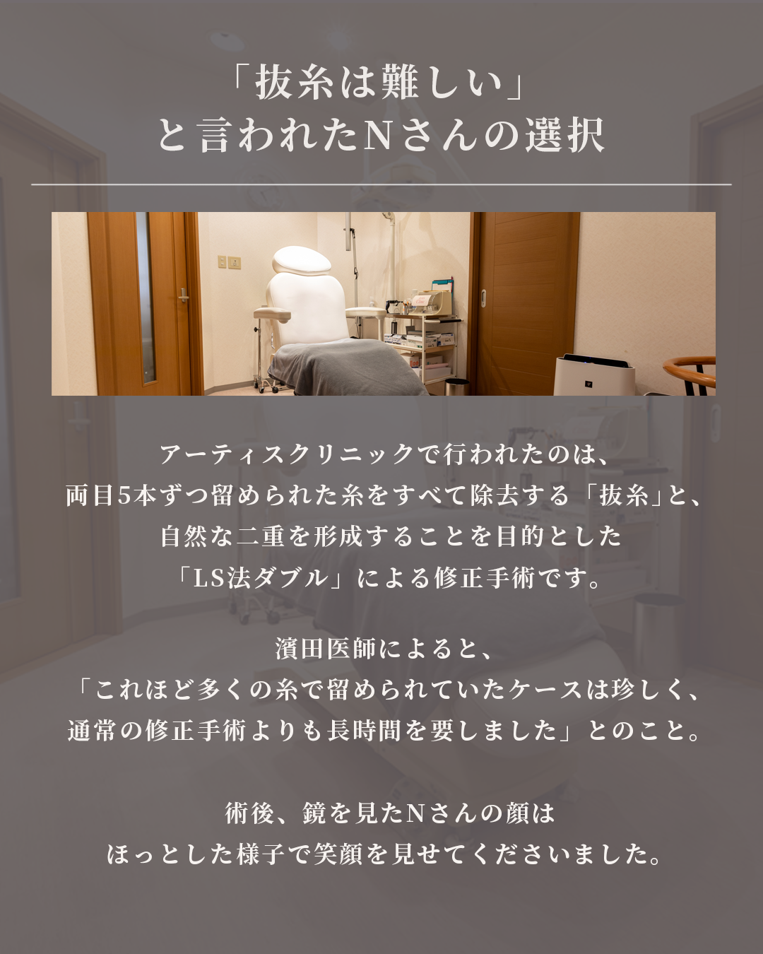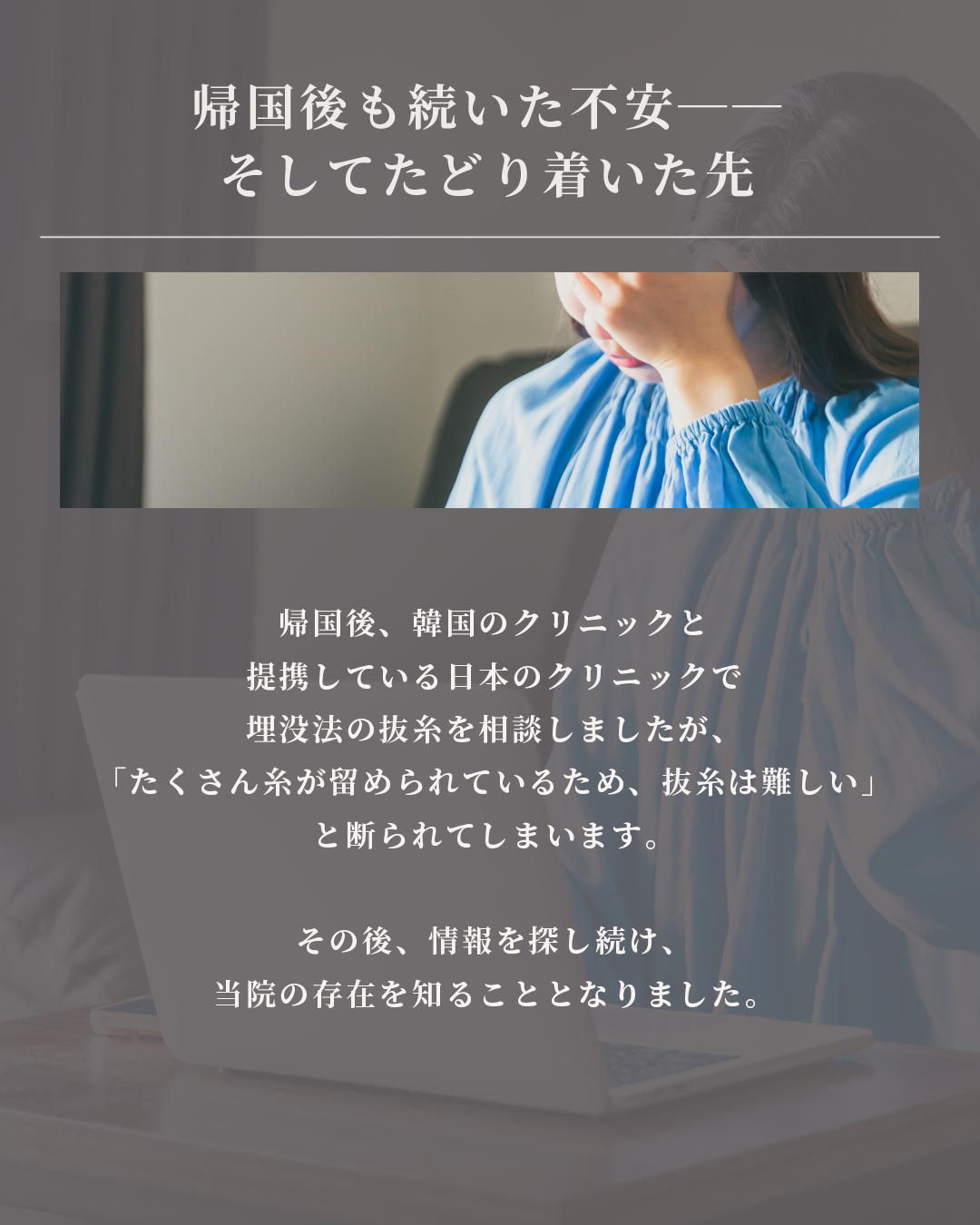 もしも貴方が現在とても辛い思いをしていて抜糸をお考えであれば、ご相談だけでもかまいません、是非一度当院に来院されてください。